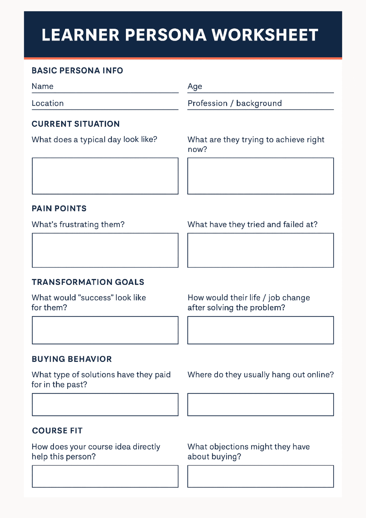If you're not sure how to define your target persona, download this learner persona building worksheet (a free PDF). Simply answer the questions from your perspective, and you’ll eventually gain the clarity you need.