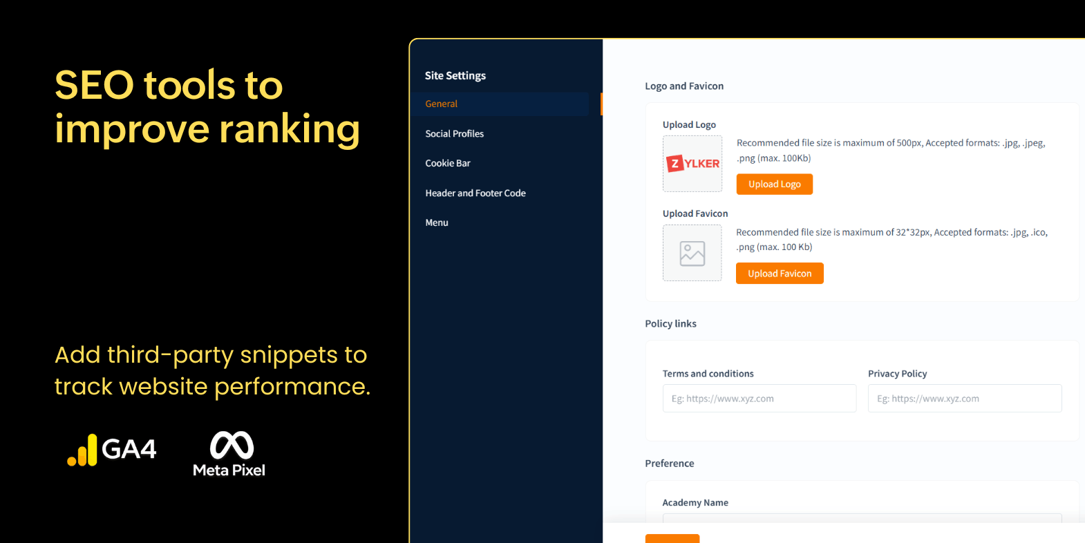 Connect your preferred marketing automation and analytics tools using the comprehensive Header and Footer customization feature. Using the Header and Footer tool, you can now embed analytics scripts, chat widgets, email marketing tags, or tracking pixels directly into your site, all from one place.