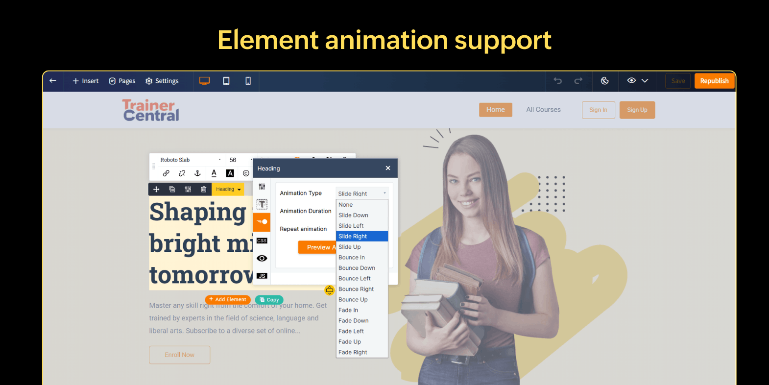The new TrainerCentral Website Builder isn’t just a simple feature upgrade, it’s a major forward leap for course creators looking to build their brand's online presence. It offers powerful designing tools, beautiful templates, animation effects, and smart SEO, all in a simple package.