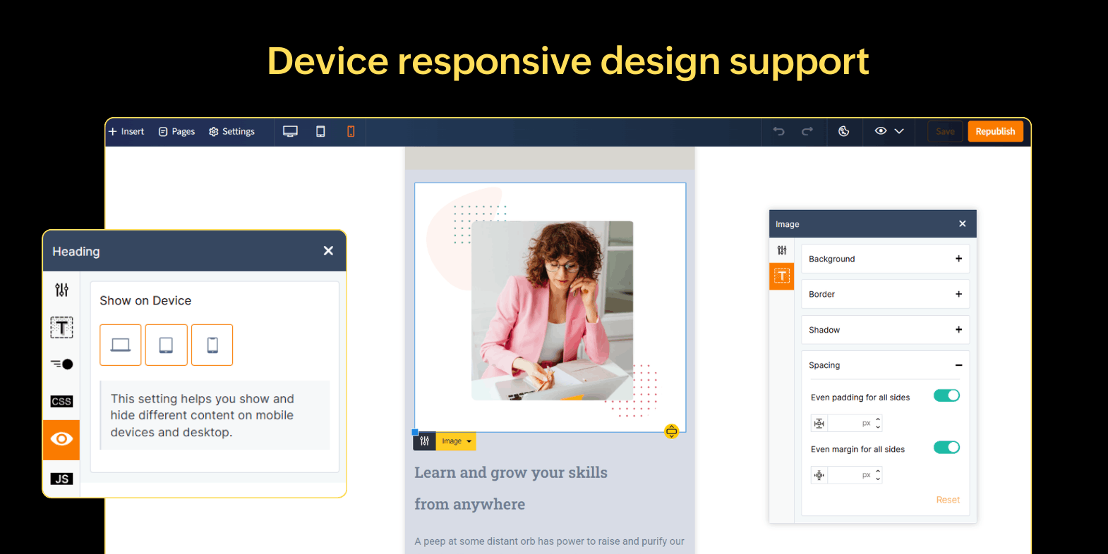Advanced designers who prefer to add unique design elements can now add custom CSS and JavaScript to fine tune layouts or add interactive elements. Want a custom countdown timer for your launch? Or adjust the spacing between elements? You can do it all using custom CSS and Java Scripts.