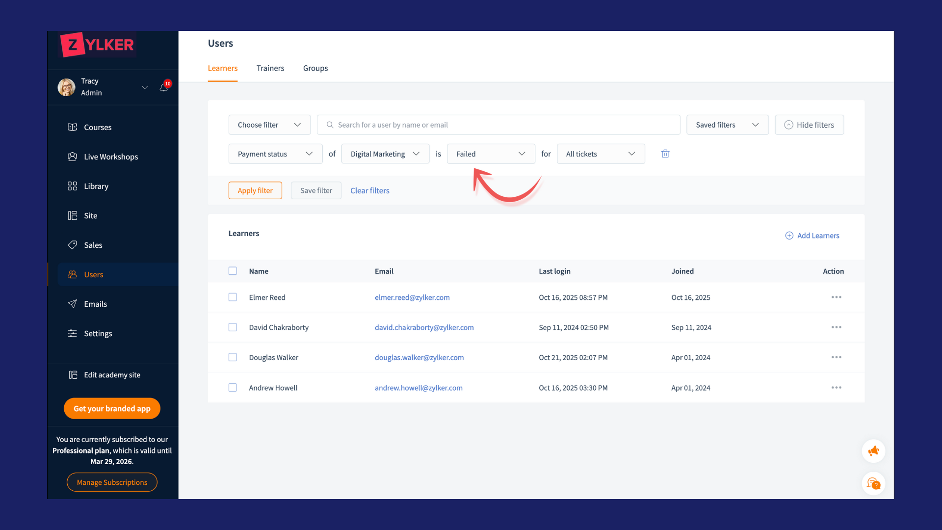 We’ve added a new filter option, Failed that lets you quickly identify learners whose payments have failed. This helps you manage pending transactions efficiently and take timely follow-up actions, such as sending reminders or personalized emails.