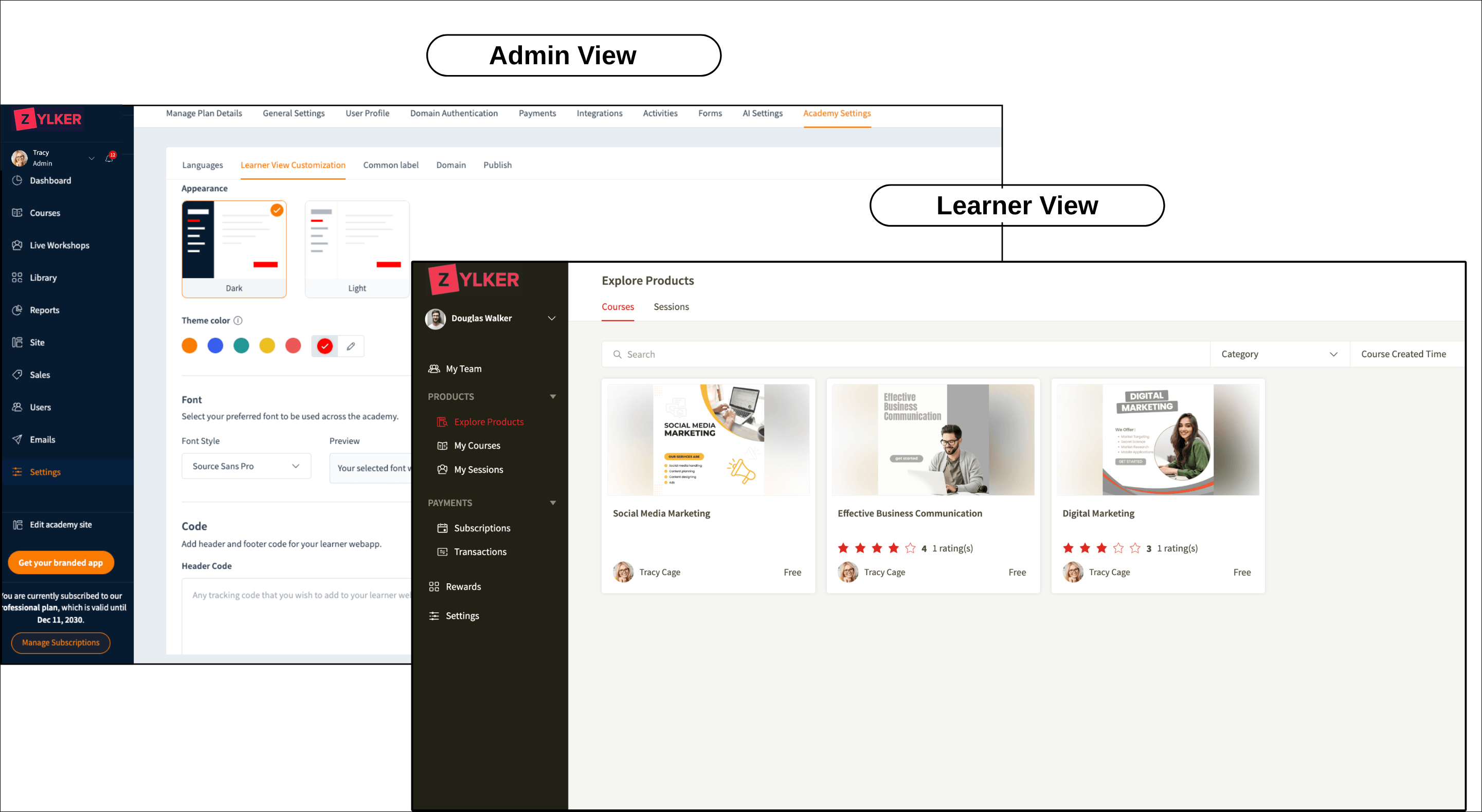Customize your academy's look and feel for your learners. You can change the appearance, theme color, and font style of the course and session viewers to align with your brand and ensure a consistent and professional experience across your academy.