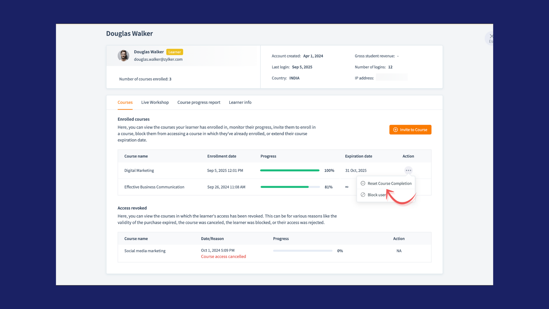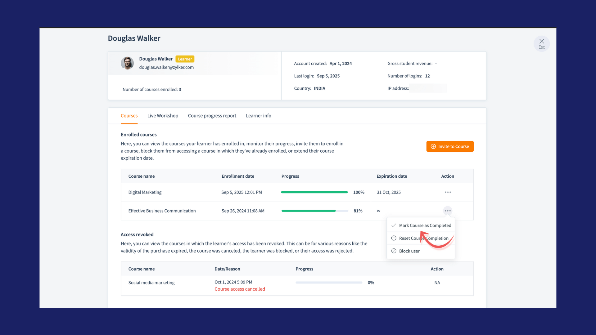 You can now reset a learner’s course or lesson completion. This enhancement is particularly useful when course materials are updated or when you need to reassess learners.