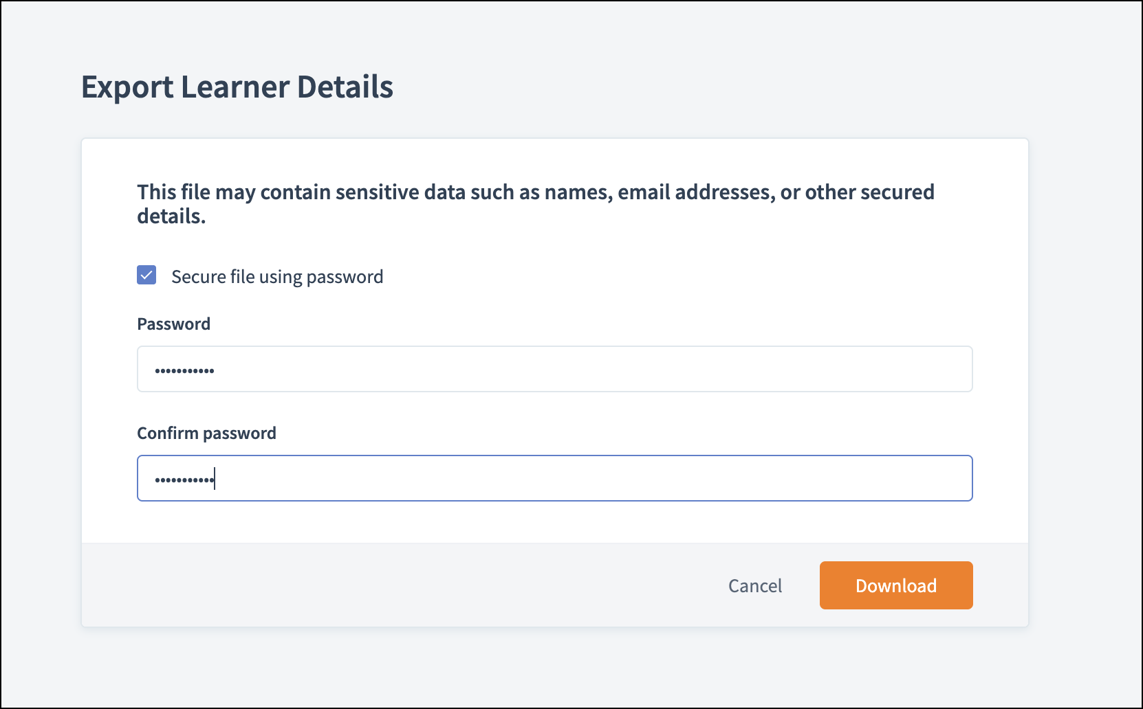 Set a password to access exported files, such as learners' details, course progress, test reports, and more, and provide an extra layer of protection for sensitive learner data. This ensures you have full control over who can view your files.