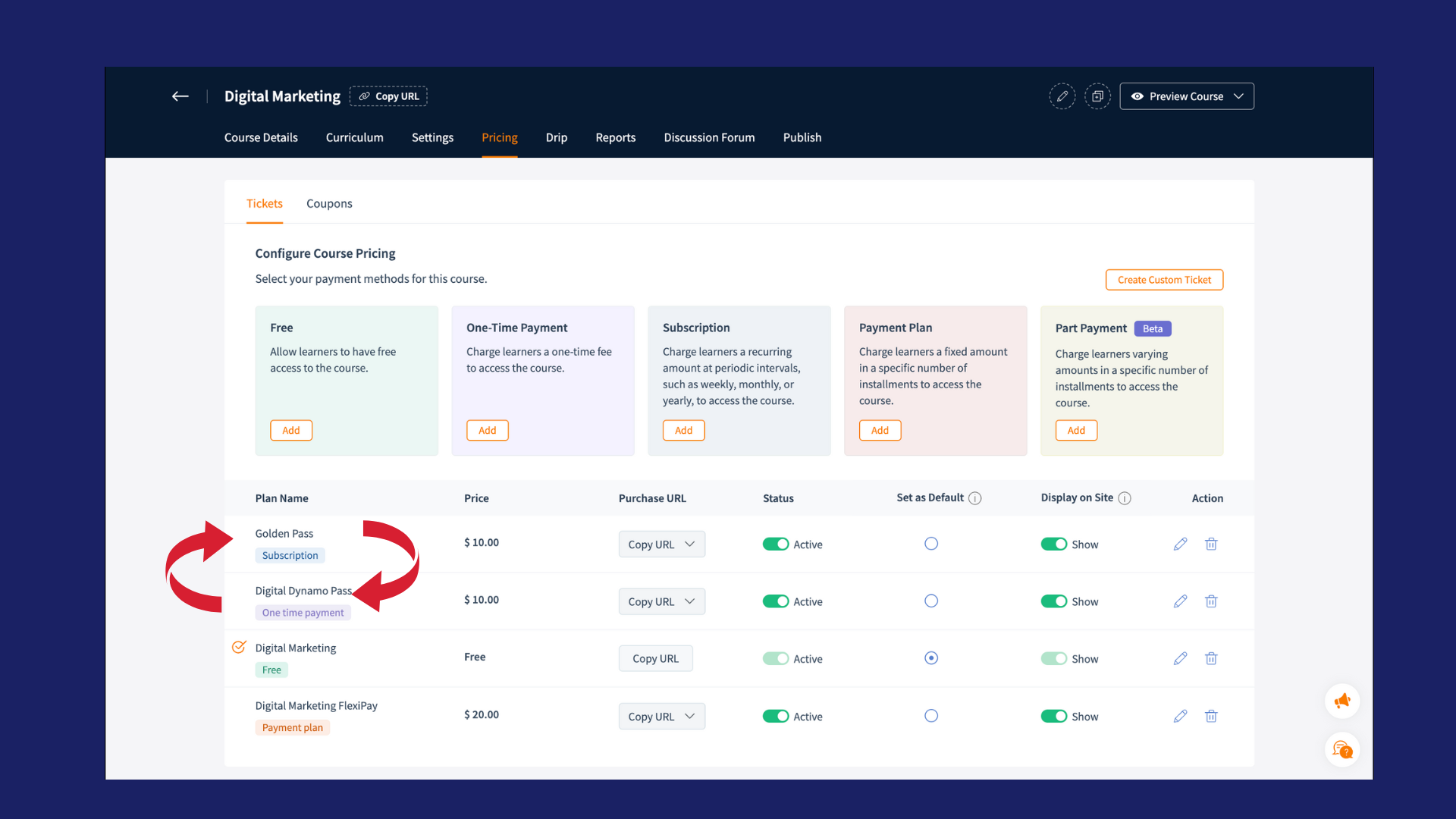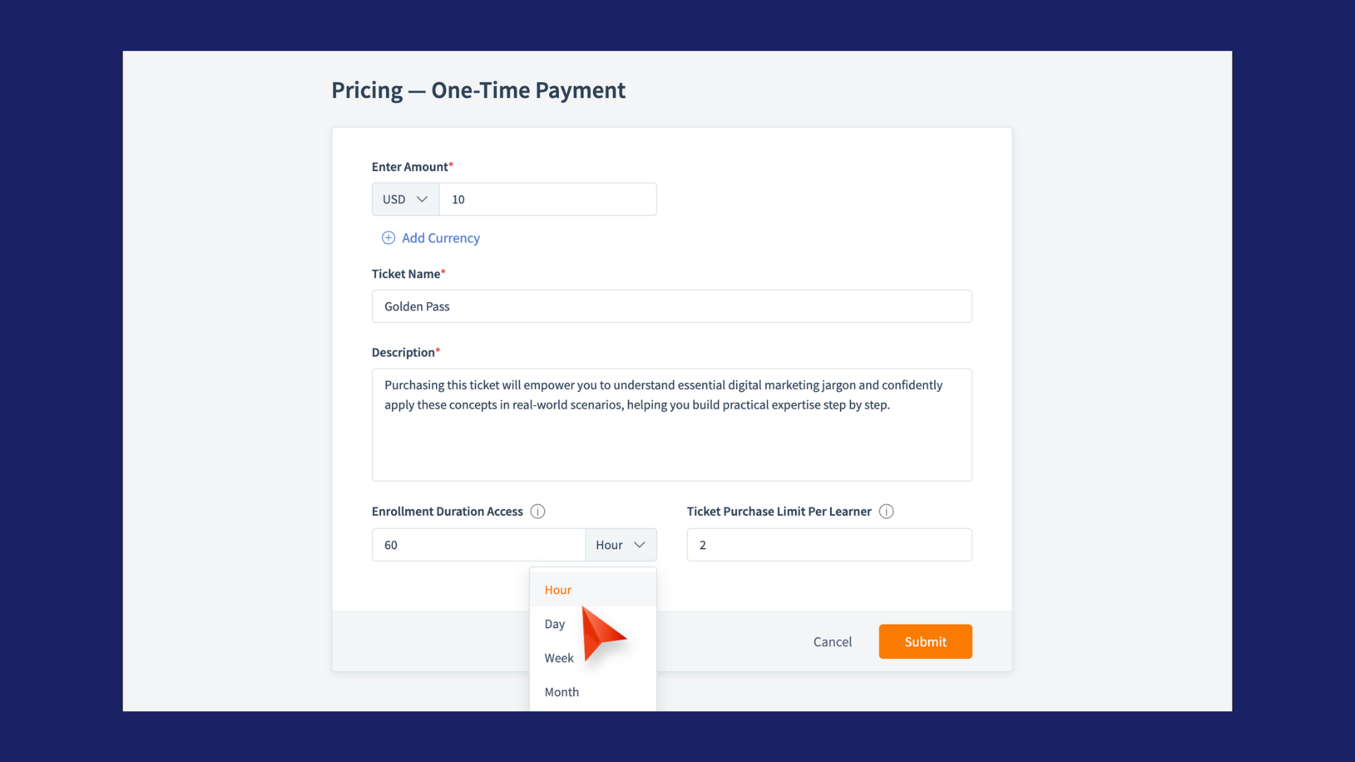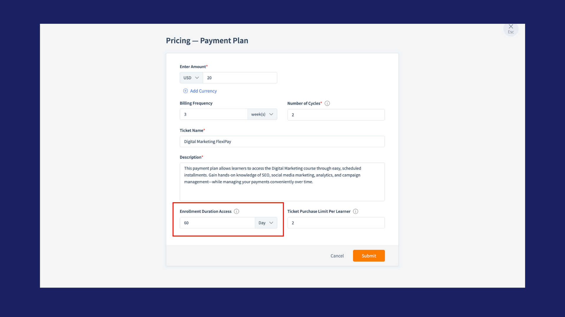 Set an access duration for the payment plan ticket and take full control over how long learners can engage with your course content.
