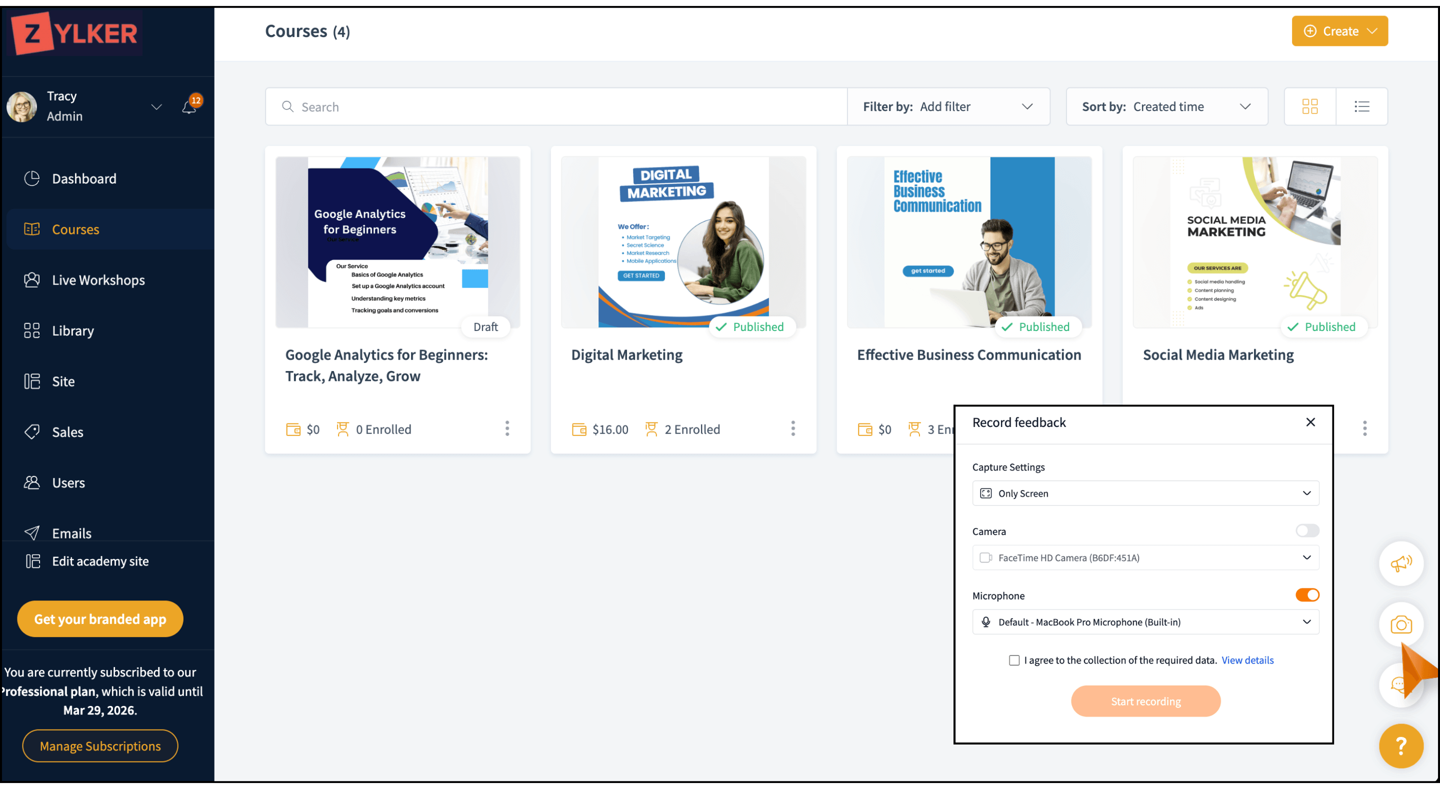 TrainerCentral now integrates with Zoho Quartz, which is a diagnostic tool that enables you to report issues and provide visual feedback through contextual recordings. You can now record and share feedback with the TrainerCentral support team to enable faster and more efficient issue analysis.