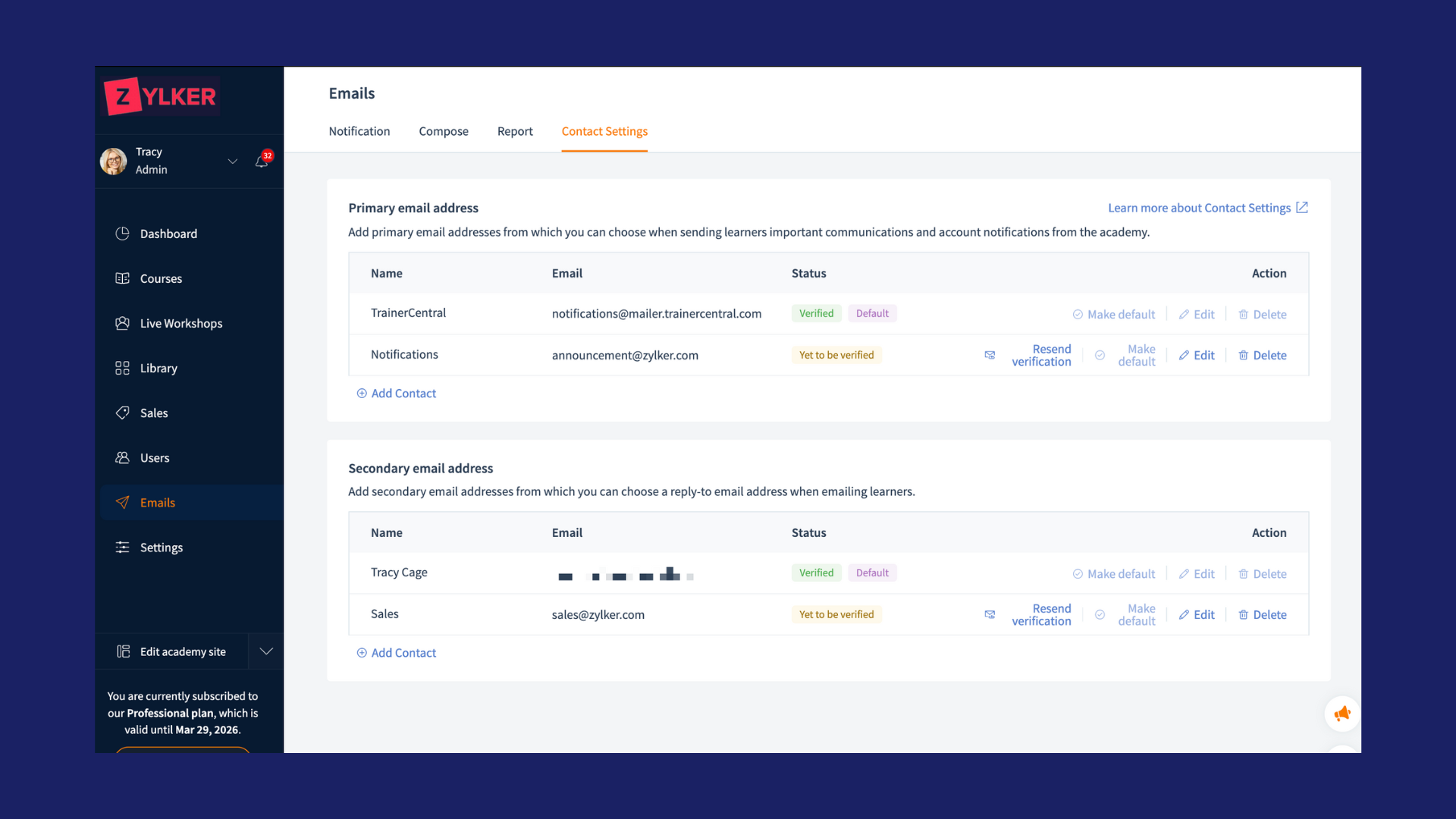 You can now add custom verified email domains as both primary and secondary email addresses. The primary email address is used to send important communications to learners, while the secondary email address serves as the reply-to address for learners to send emails back. You can add multiple email addresses and choose the appropriate one when sending emails to your learners.