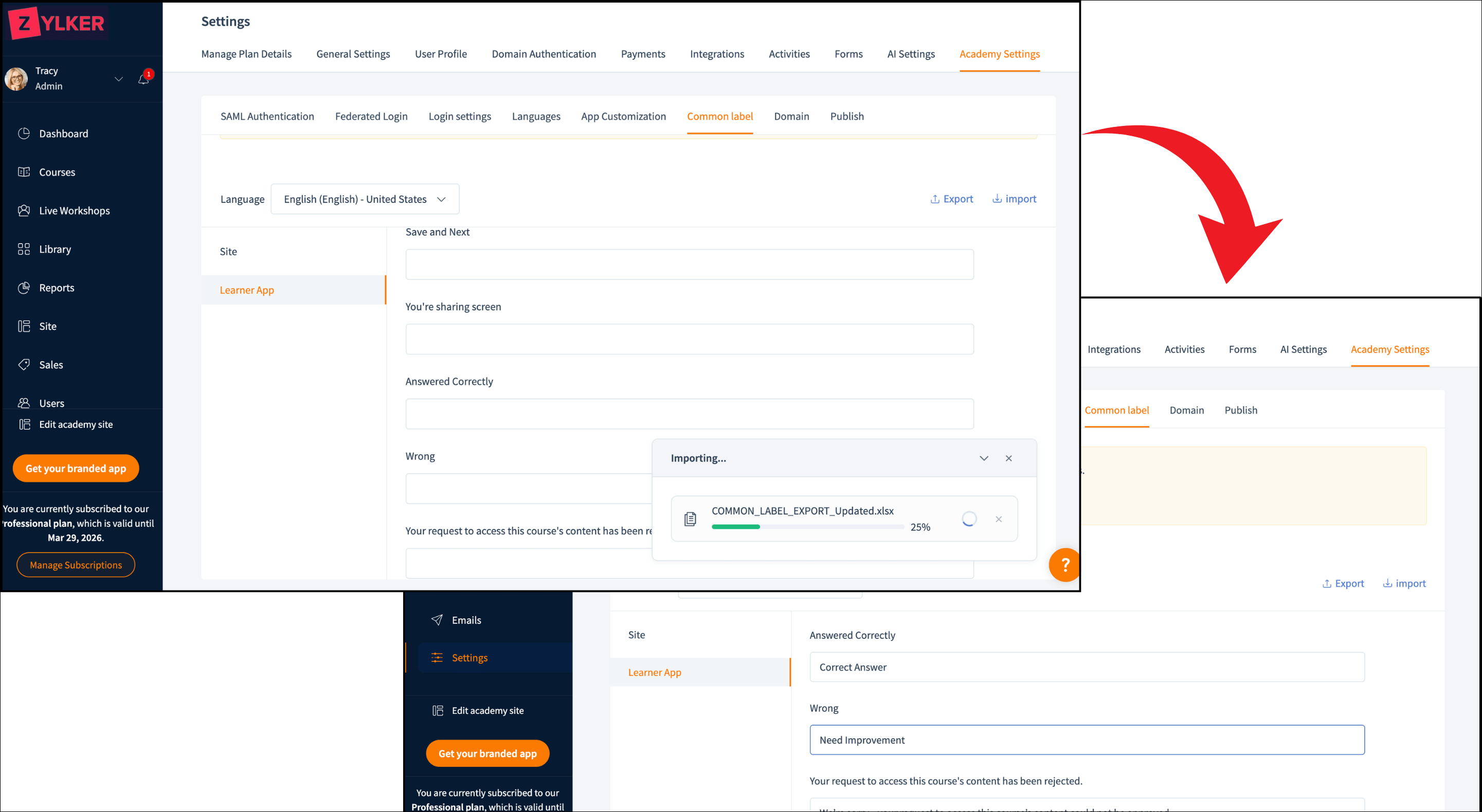 Common labels help you customize user interface labels, messages, and terminology in learners’ languages to improve accessibility. To speed up the data collection process, you can now use the import option to collect common labels and their equivalent user interface labels. Similarly, the export option can be used to reuse the same set of common labels across other academies or to back up your configurations.