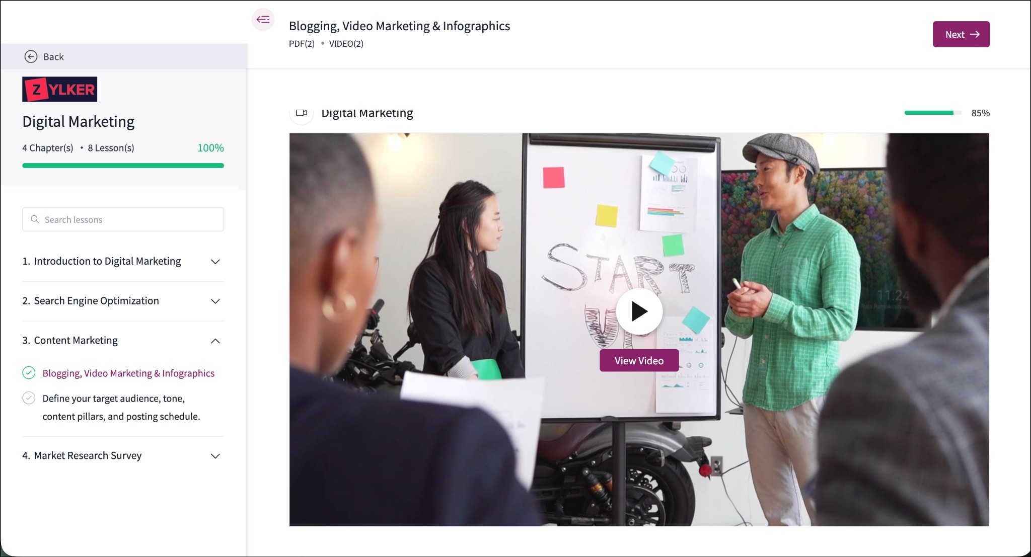 Help learners stay on track with progress indicators in learning materials. Progress bars are now available for PDFs and videos, allowing learners to see how much content they have completed. This added visibility encourages continued engagement and supports steady learning progress.